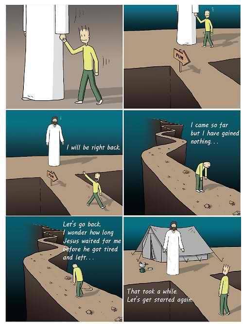 I’ve always seen this image where a person is walking along with God, then gets distracted and goes off the path on their own while God stops and waits. Eventually the person realizes that they have gotten away from God and turns around to find their way back to Him waiting right where they left Him.